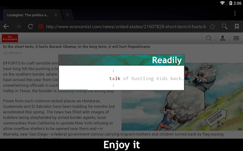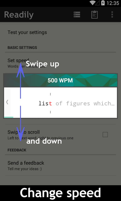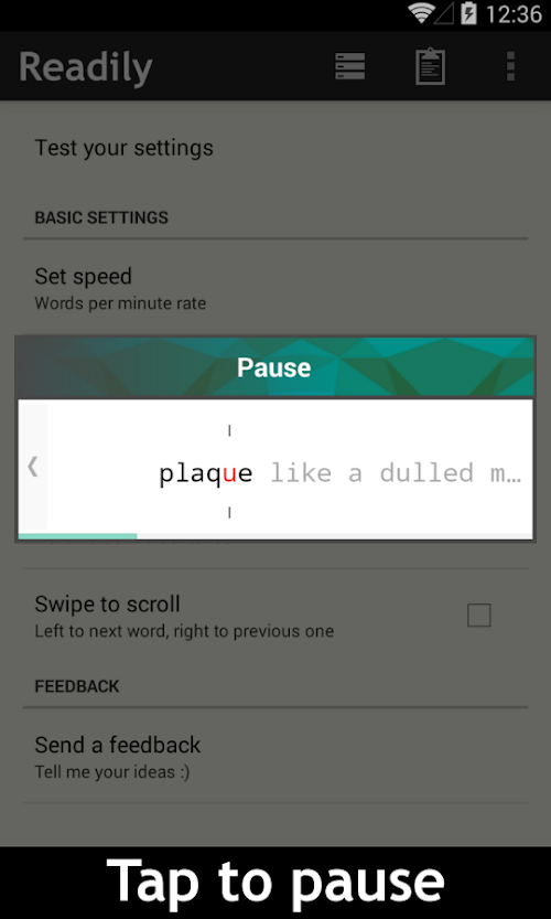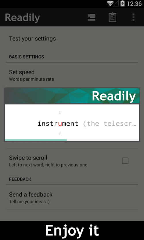 Readily is a speed-reading android application powered by RSVP(Rapid Serial Visual Presentation) technology. With it you can read up to 1200 words per minute instead of 220 when reading normally.