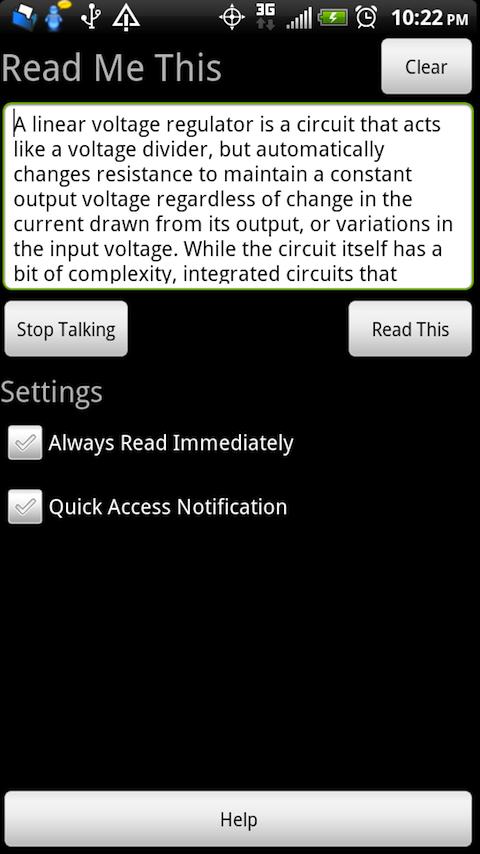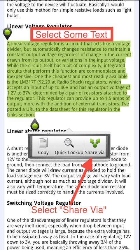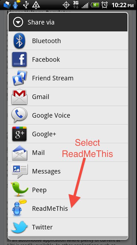 ReadMeThis is an app that receives text from the "Share Via" menu that pops up after you select text.