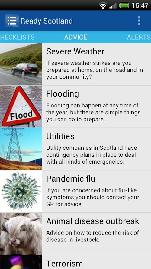 The app will provide basic but essential information on emergency types and how to prepare for them; store the contents of a household emergency plan; provide local emergency contact details, allow the user to add personal contacts and provide the user with car and emergency kit checklists. Enables the user to access information on Ready Scotland – the Scottish Government’s public information portal on preparing for emergencies – offline.