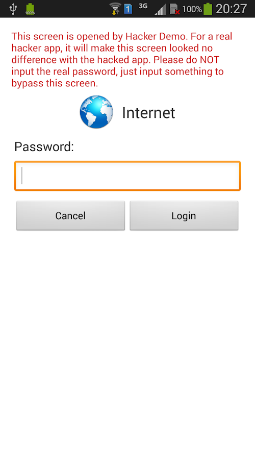 This tool will show you how a hacker app could be. It will demonstrate the basic steps a hacker app may take to hijack the password.