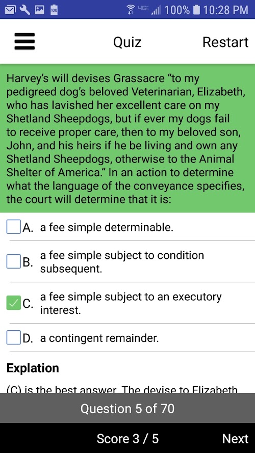 - 70 MBE-style multiple-choice practice questions with scoring and detailed explanatory answers. Test at your own pace and return to where you left off or reset the test to start from the beginning