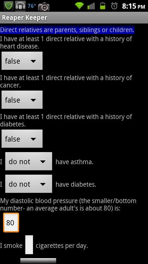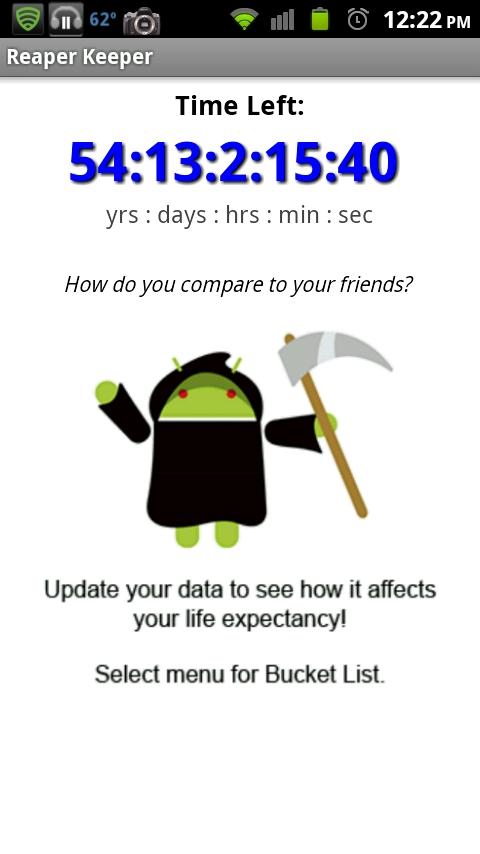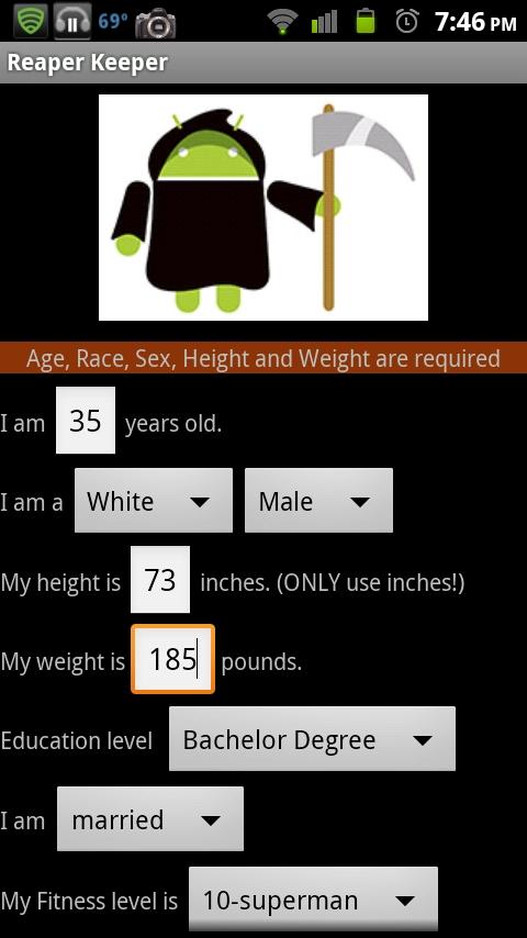 A fun and informative lifetime calculator. How many days do you have left...when will the Reaper come a knock’in? Calculate your Life Expectancy with Reaper Keeper. Then, go back into your stored data, and see how making positive changes to your fitness, education, diet and habits can extend your lifetime. You will be surprised at how significant slight changes effect your outcome. If you’re healthy, and want to see how something like diabetes or heart disease might effect your life, tell Reaper Keeper that you have it and view the results. Doctors always tell us to lose weight, exercise, stop smoking...Reaper Keeper can show you how significant those changes might be.