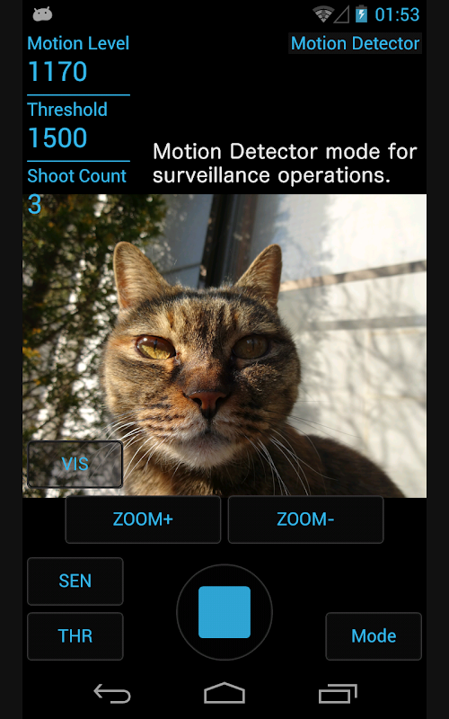 Push 'VIS button' to visualize ( red colored pixels ) the motion.
