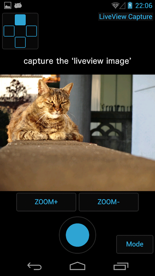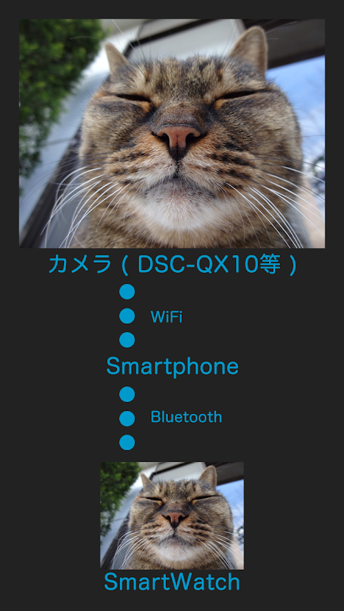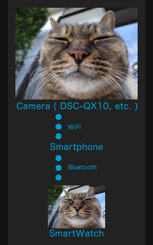 You can display the liveview, shoot/zoom on SmartWatch. ( NOTICE: This is an experimental feature. You can not use this feature for actual use. )
