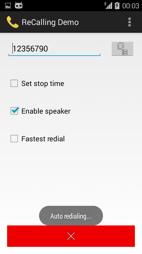 IMPORTANT: The Android API does not provide a way to detect a busy signal. Thus, if you get a busy tone ("beep beep beep"), you will have to manually cancel the call and then the app will redial again. If the call is not cancelled manually, normally the app will redial automatically after a few seconds (10-20).