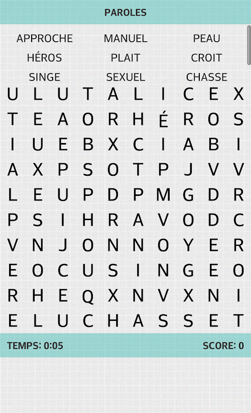 Il ya 12 mots cachés horizontalement, verticalement ou en diagonale sur un puzzle 10X10. Votre but est de trouver ces mots le plus rapidement possible.