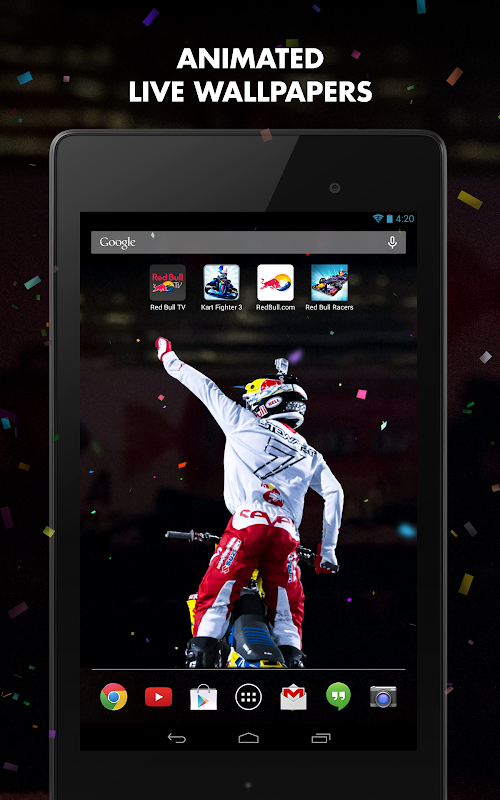 Red Bull Wallpapers brings the World of Red Bull action sports directly to your Android smartphone, tablet, and Android Wear smart watch. Customize your lock and home screen with breathtaking free sports wallpapers and exciting action sports backgrounds and backdrops in Full HD, or set your watch face to showcase selected epic pictures of the best sports action that change based on the time of day.