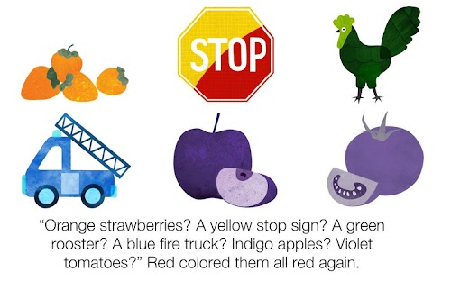 Each color has a note which sounds on a tap, together they can be played like a musical instrument. This interactivity is aimed at pulling the child into the story. As each color goes to saturate objects of the world in their hue, the child reader can touch each object and it will fill with that color and play the color’s note.