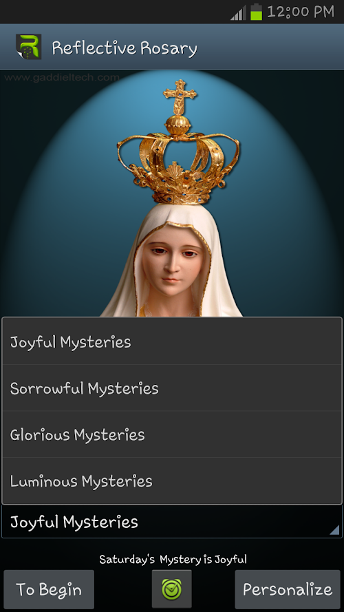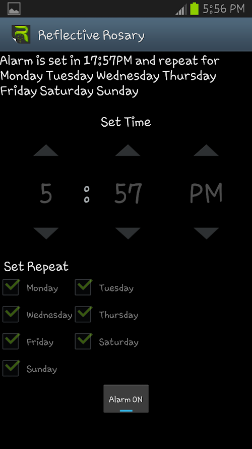 ALARM for Wake-up or reminder for Rosary Prayer can be set. Rosary with Mystery for the day is started at the set time.