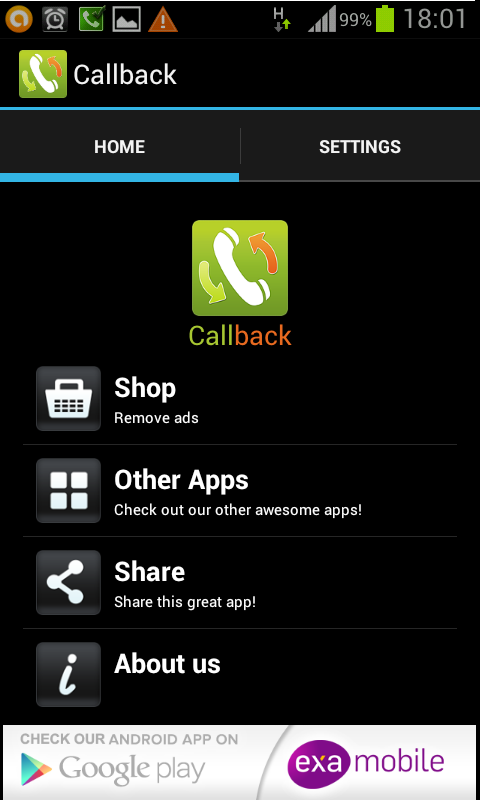 Warning: the app allows free calls under condition of using an unlimited tariff with any of the mobile operators. Before you start using the app please familiarize yourself with all the conditions of your operator’s tariff. Usually unlimited tariffs include only national calls to most/all of the national networks. Be especially careful with international calls – they are usually excluded from the unlimited tariffs and thus won’t be free. CallBack app does not offer free calls but allows you to reject incoming call and automatically call back the rejected number. The cost of the call is always dependent on your operator’s rates and the tariff you currently use. Examobile is not liable for any additional charges from your operator when not using the app according to instructions.