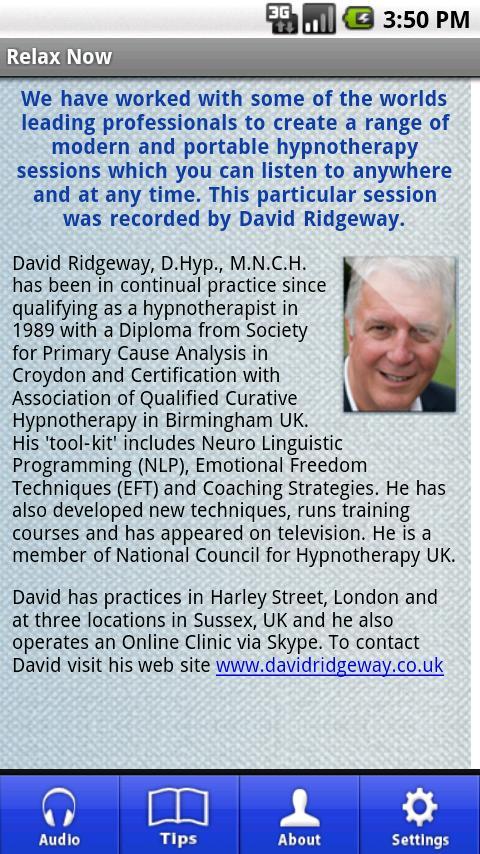 Each track in this app is a combination of spoken word by certified hypnotherapist David Ridgeway D.Hypn., M.N.C.H. and soothing, uplifting "binaural" music.