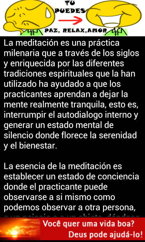 • Have you had a panic attack ? Your self-esteem is appropriate? Do you know the benefits of meditation, relaxation and yoga? Do you look at life with joy , enthusiasm , vitality and enthusiasm ? The answer to all this is the same word : meditation.