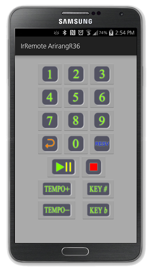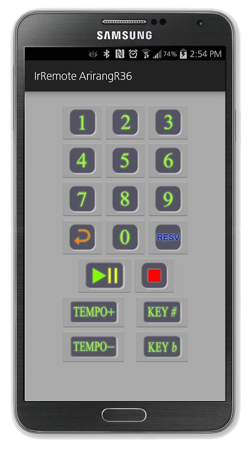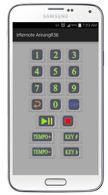 Karaoke Arirang R36 Remote app is the simple remote control device for Samsung / HTC Android use IR blaster to control DVD Karaoke Arirang R36 machine. Very simple, no need to install configuration. Download the application to your computer and enter the song right on your phone.