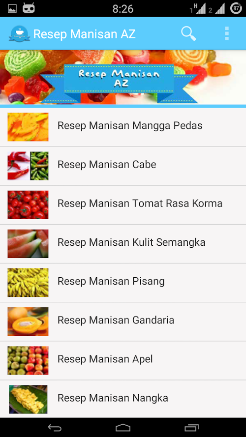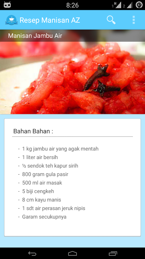 Aplikasi Resep Manisan A-Z berisi tentang resep yang akan selalu diupdate setiap minggu. Mulai dari manisan buah buahan, agar agar ataupun manisan rumput laut yang diambil dari berbagai sumber.