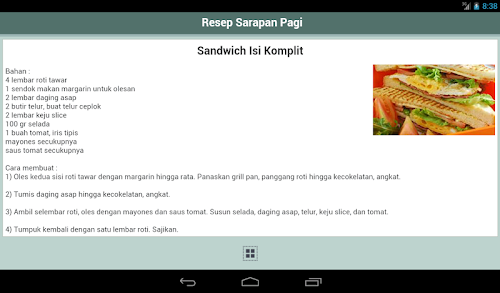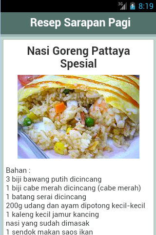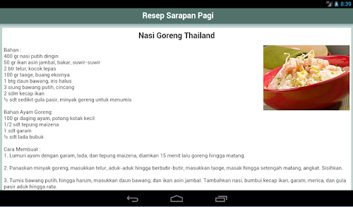 Aplikasi Resep Masakan Indonesia seri Resep Sarapan Pagi. Di dalam aplikasi resep masakan ini terdapat bermacam-macam jenis menu sarapan pagi seperti bubur, nasi goreng, aneka roti, sandwich, cake dan lain-lain.Applications Indonesian Recipes Breakfast Recipes series. In the application of these recipes are a variety of types of breakfast menus like porridge, fried rice, various breads, sandwiches, cake and others.