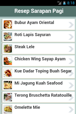 Aplikasi Resep Masakan Indonesia seri Resep Sarapan Pagi. Di dalam aplikasi resep masakan ini terdapat bermacam-macam jenis menu sarapan pagi seperti bubur, nasi goreng, aneka roti, sandwich, cake dan lain-lain.Applications Indonesian Recipes Breakfast Recipes series. In the application of these recipes are a variety of types of breakfast menus like porridge, fried rice, various breads, sandwiches, cake and others.