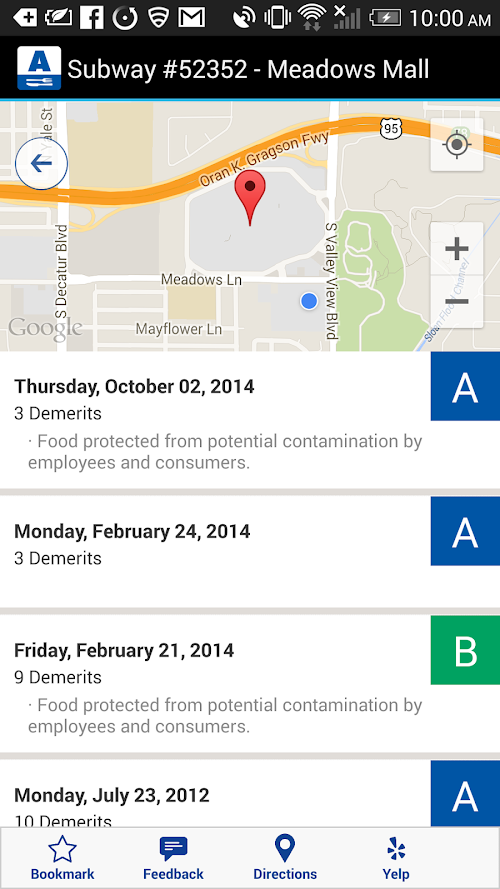 See current and historical restaurant inspection grades from the Southern Nevada Health District. Find information for all restaurants in your area or search for restaurant grade cards by name. View Yelp ratings for restaurants.