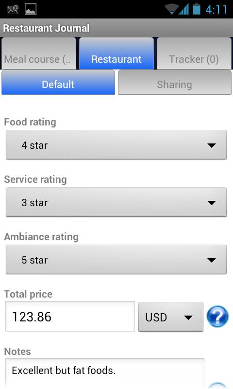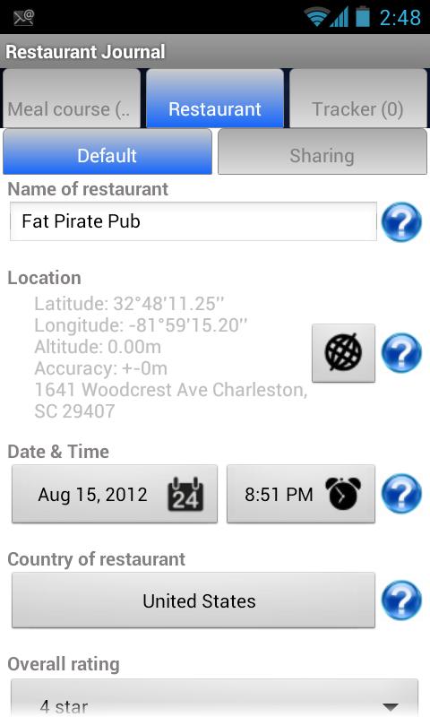 When a restaurant dinner is created it automatically documents the longitude, latitude, altitude, time, and date with instant access to the smartphone camera, audio recorder, notes, and a theodolite (for calculating distances to or elevation of objects) to further document the event.