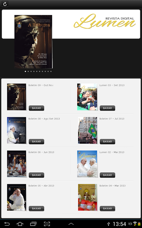 A Revista Lumen é uma publicação digital católica desenvolvida pela Arquidiocese de Campinas – SP, disponível gratuitamente nas plataformas web online, aplicativo para tablets e download para computadores no portal da arquidiocese. O surgimento de uma revista digital católica, produto ainda pouco desenvolvido pela Igreja no Brasil, se dá em atenção aos documentos do Magistério recente quando apontam a preocupação de que, na evangelização, na catequese e, em geral, na pastoral, persistam ainda linguagens pouco significativas para a cultura atual e, em particular, para os jovens. Em sua mensagem “Verdade, anúncio e autenticidade de vida, na era digital”, o Papa Bento XVI diz que, “como qualquer outro fruto do engenho humano, as novas tecnologias da comunicação pedem para ser postas ao serviço do bem integral da pessoa e da humanidade inteira. Usadas sabiamente, podem contribuir para satisfazer o desejo de sentido, verdade e unidade que permanece a aspiração mais profunda do ser humano”. Assim vimos sendo desafiados, das tábuas da lei aos tablets, a permitir que a mensagem do Criador chegue até cada um, transformadora como é, e indique o caminho para um mundo mais justo, mais fraterno e mais íntegro. Esta é nossa missão!  Acesse e divulgue a Revista Digital Lumen!The Lumen Magazine is a digital publication developed by the Catholic Archdiocese of Campinas - SP, available free online web platforms, application for tablets and computers to download on the website of the Archdiocese. The emergence of a digital magazine Catholic product undeveloped by the Church in Brazil, takes into account the recent magisterial documents when they raise concerns, in evangelization, catechesis, and in general, the pastoral, little languages ​​still exist significant for the current culture and in particular for young people. In his message "Truth, proclamation and authenticity of life in the digital age," Pope Benedict XVI says, "like any other fruit of human ingenuity, the new communications technologies ask to be put at the service of the integral good of the person and of all humanity. Used wisely, they can contribute to satisfying the desire for meaning, truth and unity which remain the most profound aspirations of human beings. " So we saw being challenged, the tablets of the law to tablets, to allow the message of the Creator reaches each transformative as it is, and indicate the way to a fairer, more fraternal and more righteous. This is our mission! Go and spread the Lumen Digital Magazine!