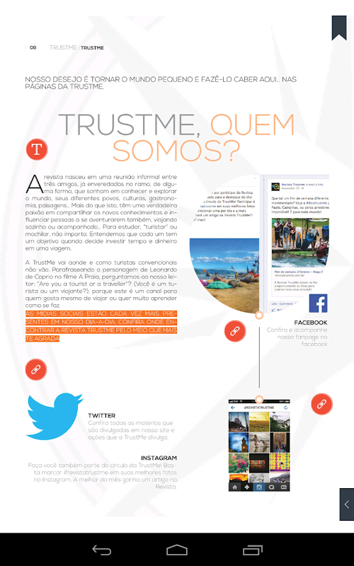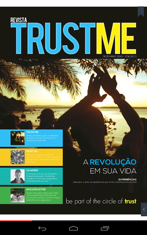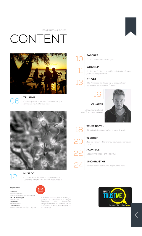 Somos um guia digital com conteúdo fidedigno para quem gosta de se aventurar em viagens, ideias, fotografias, esporte e gastronomia. Uma revista em que o leitor, viajante e apaixonado por novidades, pudesse confiar. Daí o nome TRUST ME.
