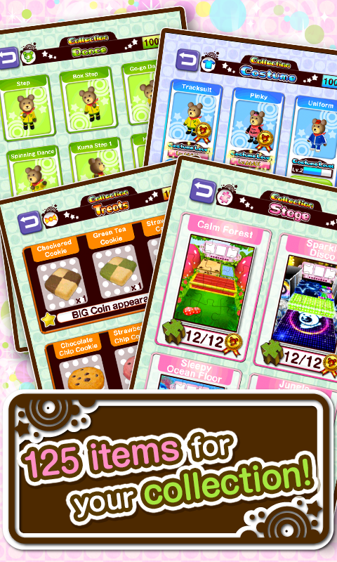 The sweets and costumes you collect, the stages you unlock, and the dances Kuma learns can be viewed in the Collection Room.