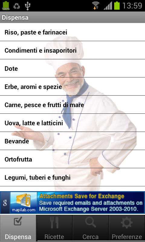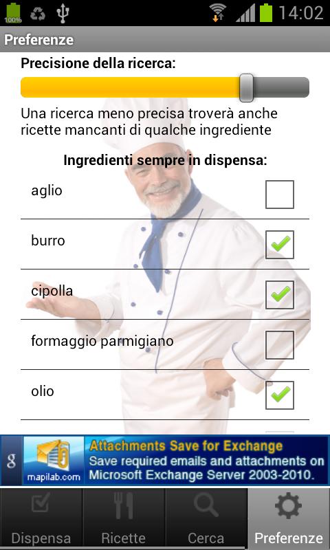Riempi la dispensa con gli ingredienti principali che hai in casa (nelle preferenze è possibile impostare gli ingredienti base che hai sempre in casa per non doverli inserire ogni volta).