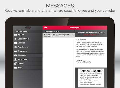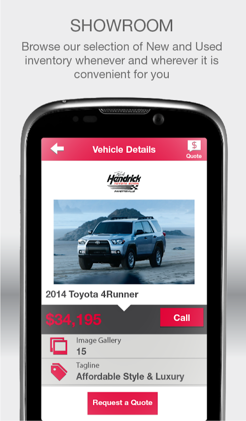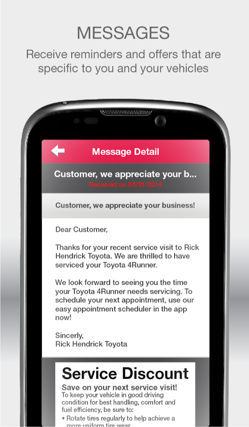 Make your vehicle ownership experience easy with the free Rick Hendrick Toyota mobile app. This feature-rich app allows you to get the most out of your vehicle by helping you to maintain and organize essential car details like service history, as well as save money with mobile offers and coupons!