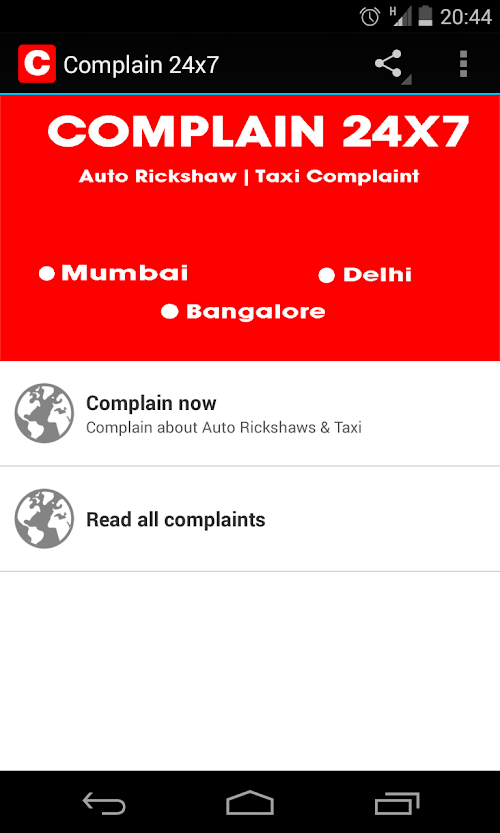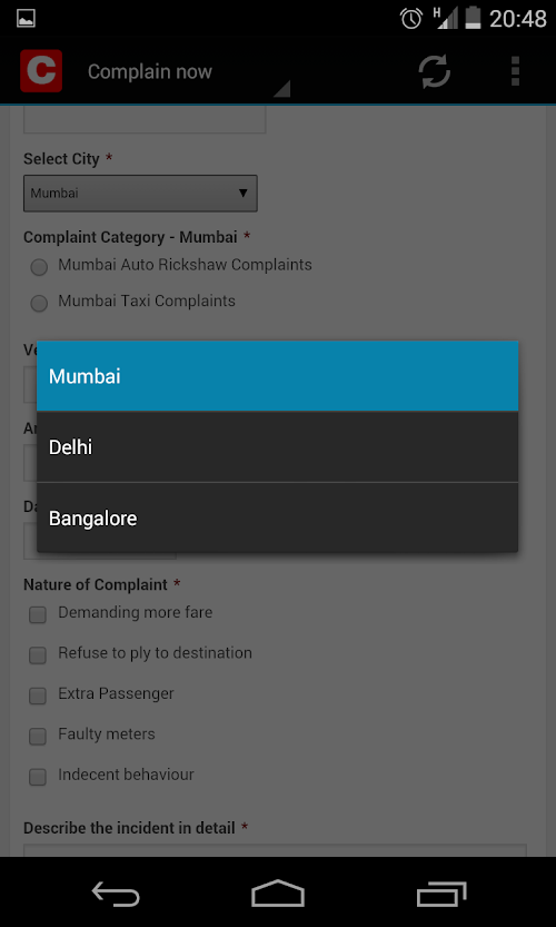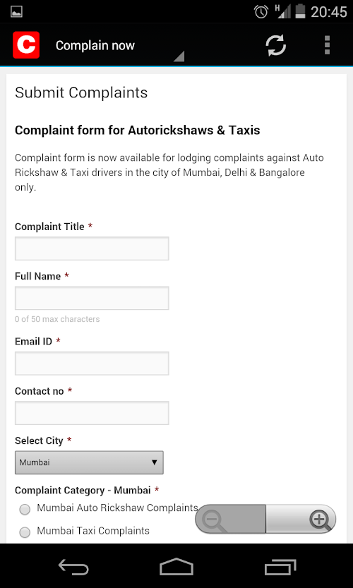 Complaint form is now available for lodging complaints against Auto Rickshaw & Taxi drivers in the city of Mumbai, Delhi & Bangalore only. (More cities coming soon)