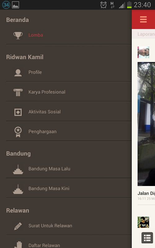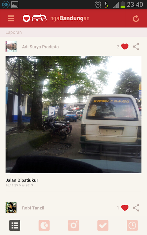 In this feature the user can see the problems in the city of Bandung which has been verified by the admin. Users can also like and share me the most important reports to be followed up.