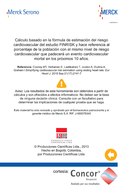 Es una aplicación desarrollada para profesionales de la salud. No sustituye la consulta médica. La evaluación de sus resultados debe ser desarrollada por un Profesional de la Salud.Application that calculates the ten-year cardiovascular risk as important parameter taking heart rate, and sex of the patient, whether or not smoking, total cholesterol and systolic blood pressure.