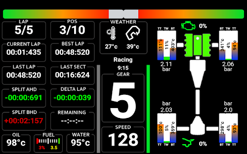 Multiple layouts with lots of information such as lap times, RPM, RPM lights, speed, current gear, tyre temperatures, fuel range and pedal positions.