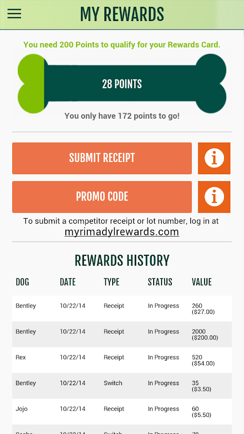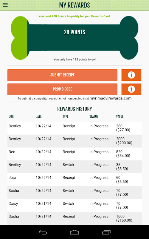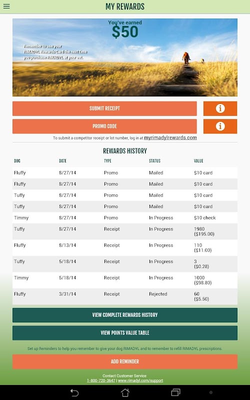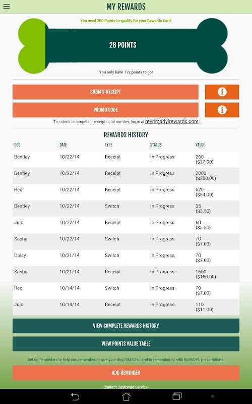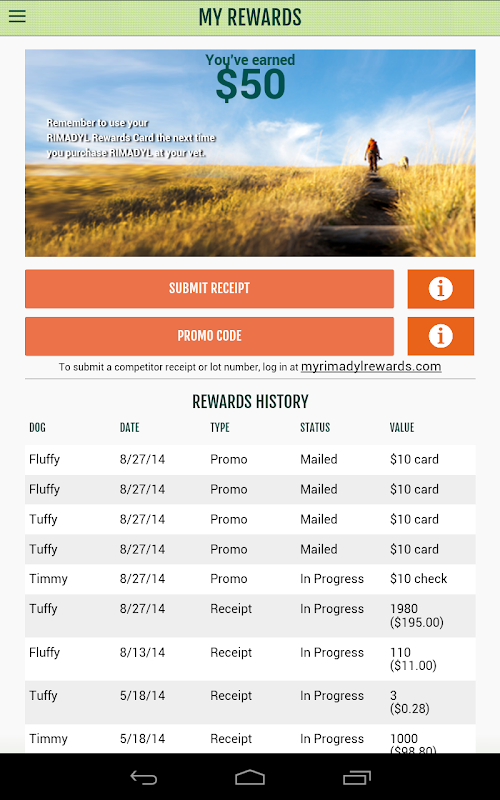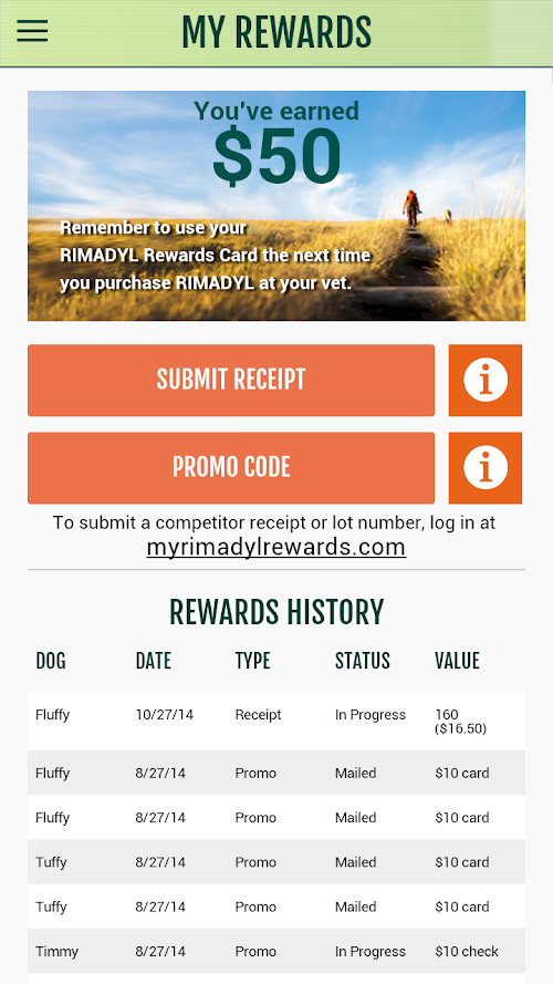 The new application from RIMADYL Rewards has been completely redesigned and is available on Android! Now you can submit Rewards requests before you leave the veterinarian, or check your account balance while you’re checking out. Easily add a new dog, check the status of a request, or set up push notification reminders right on your smart phone!