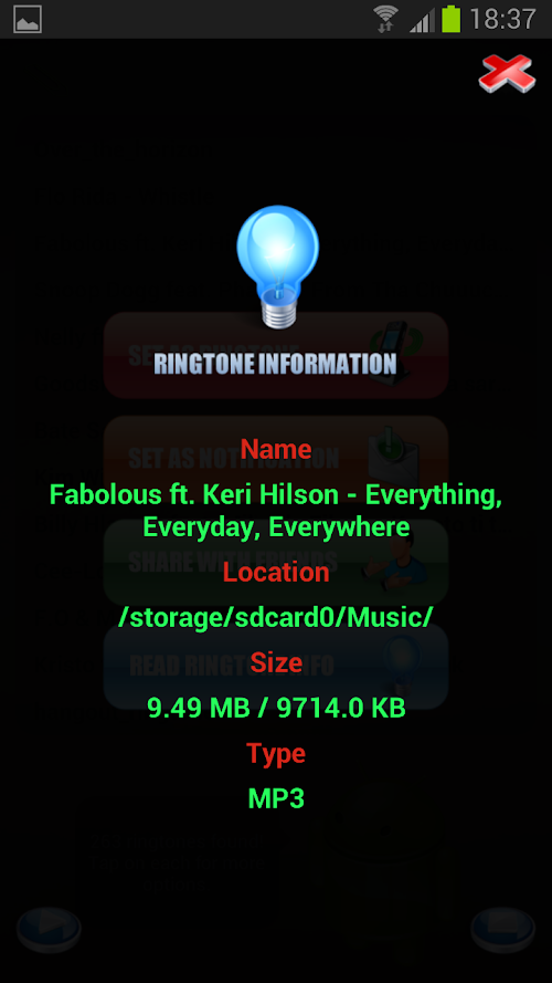 Ringtone Scanner will help you to find, set and share ringtones fast and easy! Provides a standard mechanism to search and set audio files as call or notification tone on every Android device. No more "how to change the ringtone on my device" and "where this audio file is located". Ringtone Scanner will make this for you! Supported file types are MP3, WAV and OGG. Get Ringtone Scanner now for FREE!