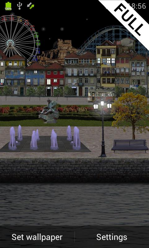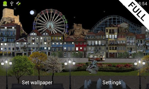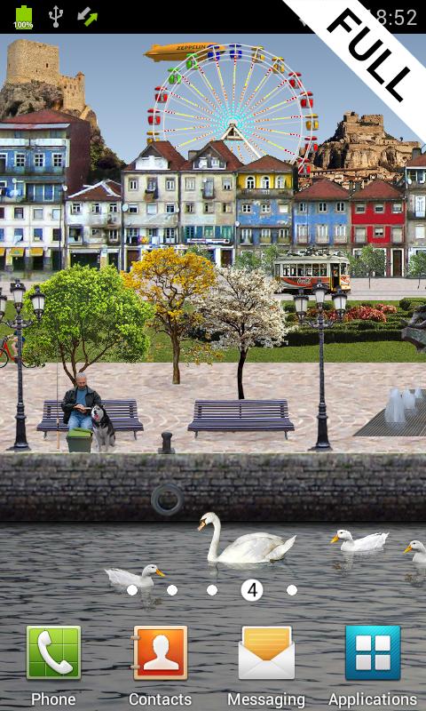 With this amazing River Park live wallpaper enjoy a very nice park in the riverside with the ferris wheel (big wheel), the river, the roller coaster, the bikes, the swing and the ducks, the streetcar (tram), people, the dog, the houses of the town... and more.