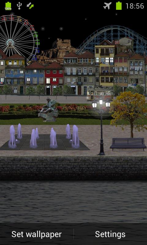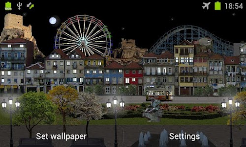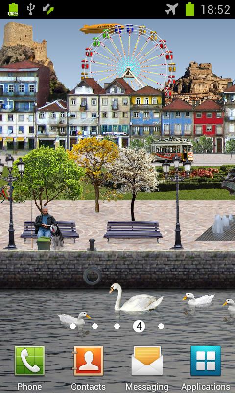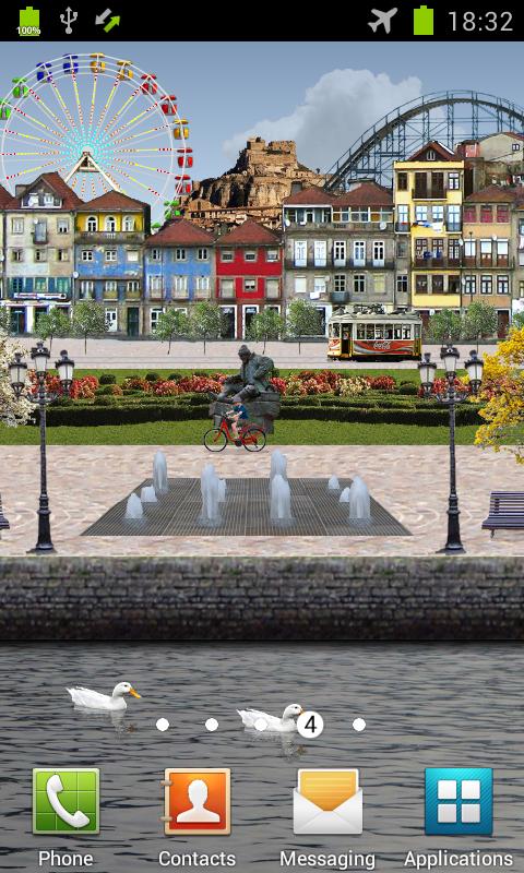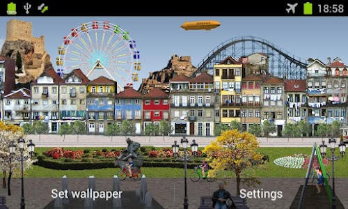 With this amazing River Park live wallpaper enjoy a very nice park in the riverside with the ferris wheel (big wheel), the river, the roller coaster, the bikes, the swing and the ducks, the streetcar (tram), people, dog, the houses of the town... and more.