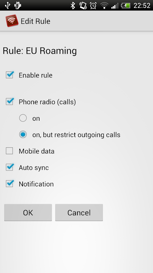 Roaming Control automatically enables or disables mobile data connection, airplane mode or auto sync based on the currently active network operator.