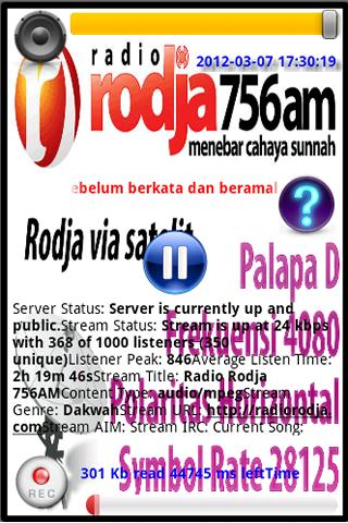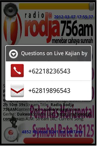 "Un Official". Aplikasi Radio Dakwah Streaming ini dilengkapi dengan fitur untuk merekam kajian yang sedang didengarkan dan dilengkapi juga fitur untuk call dan sms ke Radio Rodja 756AM. fitur ini sangat berguna bagi antum yang ingin mengajukan pertanyaan secara langsung jika ada kajian yang disiarkan secara live di Radio Rodja, player ini juga dilengkapi informasi jumlah listener dan jadwal kajian saat ini. Aplikasi ini telah pass-test di Platform 1.6,2.1,2.2,2.3 dan 3.0. Radio Islam untuk mengenal Islam lebih murni.
