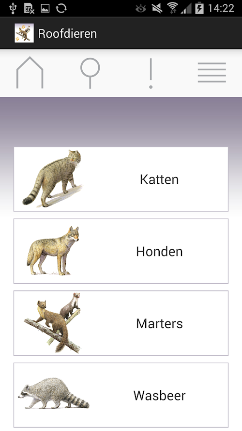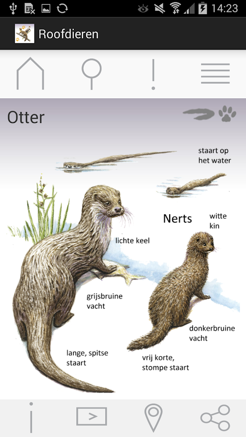 De handige app helpt bij de herkenning van alle West-Europese roofdieren. Behalve het dier zelf zijn ook zijn look-a-likes, zijn pootafdrukken en keutels afgebeeld. Tekeningen worden toegelicht met een korte tekst. Verder bevat de app tips voor het waarnemen van roofdieren.Predators capture the imagination. Some predators were nearly or completely eradicated. However, some species is making a comeback. Species such as wolf, wild cat, otter and pine marten are expanding again. To recognize the predators of the Netherlands is now the Predator Guide app.