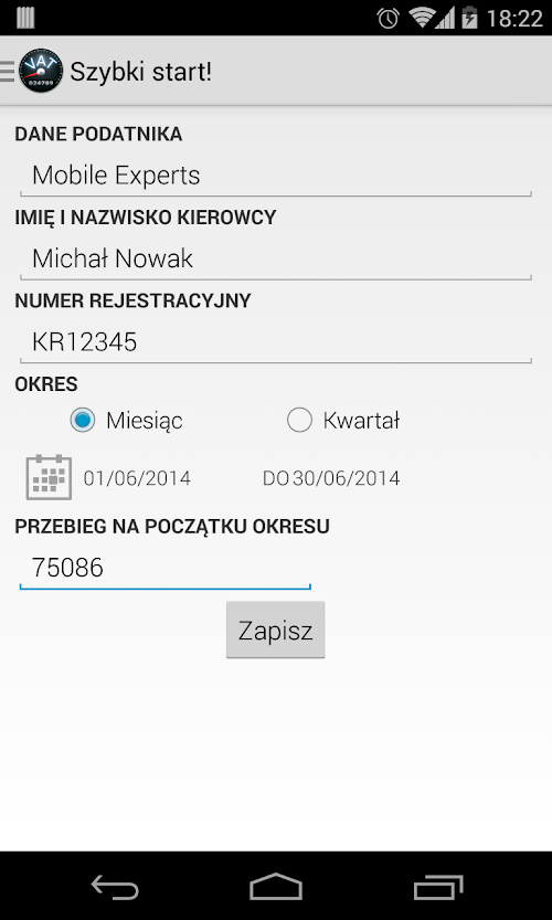 krok 1 - Na ekranie szybkiego startu podaj podstawowe informacje o podatniku i pojeździe,