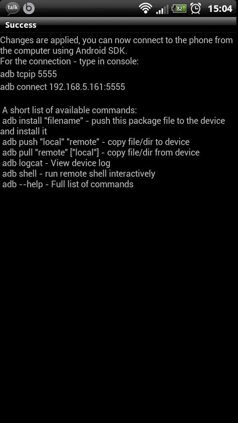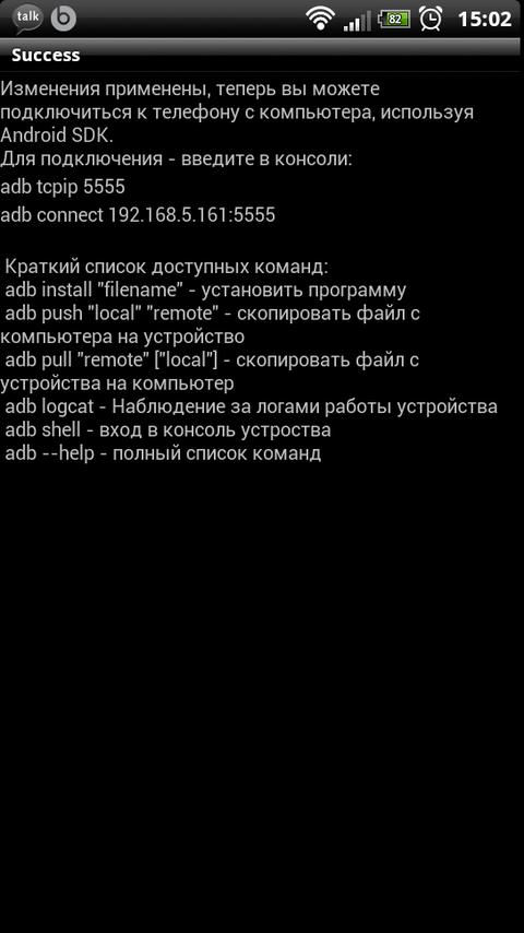 Program to connect to a device running android through the network, using the Android SDK (adb). Allows you to install a computer program on the device, as well as copy files and stuff ... The program only works on rooted phones! Download the SDK can be official site - http://developer.android.com/sdk/index.html