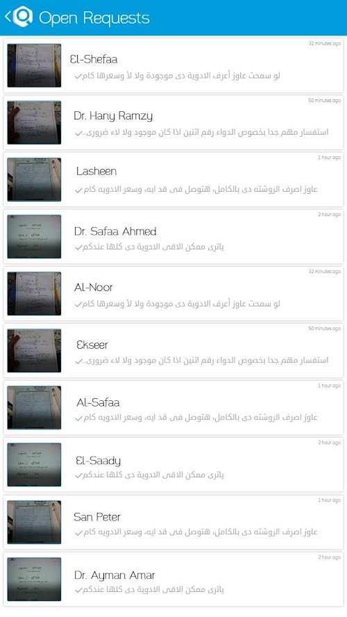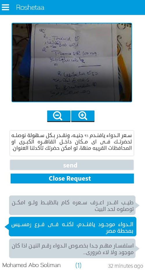 What happen when you can’t find a medicine in a pharmacy you deal with? You go from one pharmacy to another to ask about it, or you pick up your phone and start calling each pharmacy. Can you imagine the wasted time and effort to determine which pharmacy has the medicine you’re looking for? Just imagine instead of that long and hard search process, something solved the puzzle for you and directly told you which pharmacy has your medicine!!! This is our app Roshetaa, it enables you to send request for any number of pharmacies in 30 seconds to ask about anything you want and start receiving replies from each pharmacy. It is so easy, just take a photo for prescription by your mobile camera and select any number of pharmacies and send a request to all of them at once just by one click to ask about whatever you want. [We currently cover pharmacies in Egypt only]