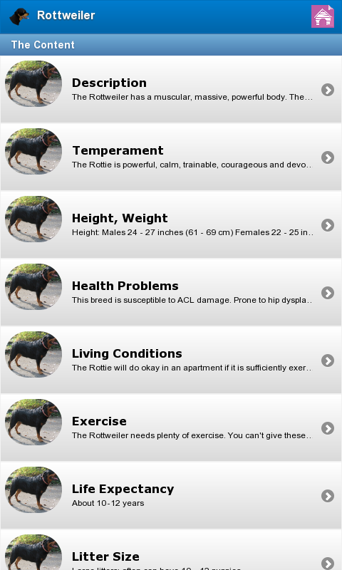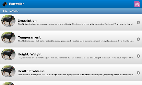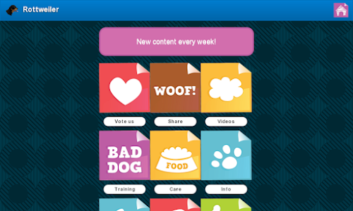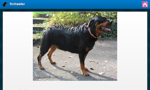Rottweiler dogs, app for Android. If you own a Rottweiler or you plan to buy a puppy soon, this Dog Breeds app is for you. Enjoy the beauty of this dog breed from your mobile phone or tablet. Includes dozens of dog pictures, photos and wallpapers, information about your dog, training lessons and more. Detailed contents: