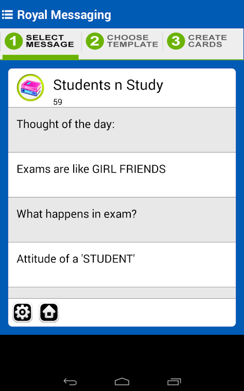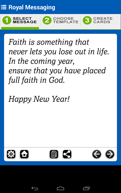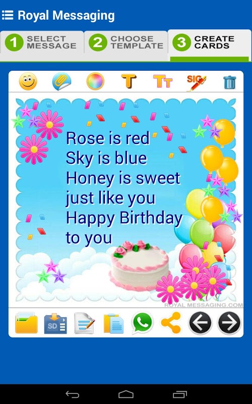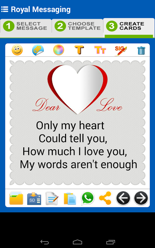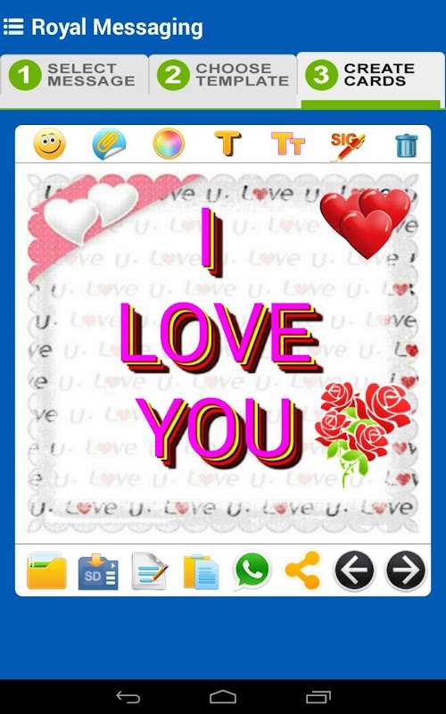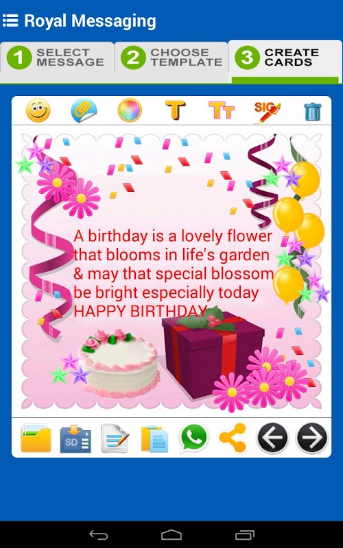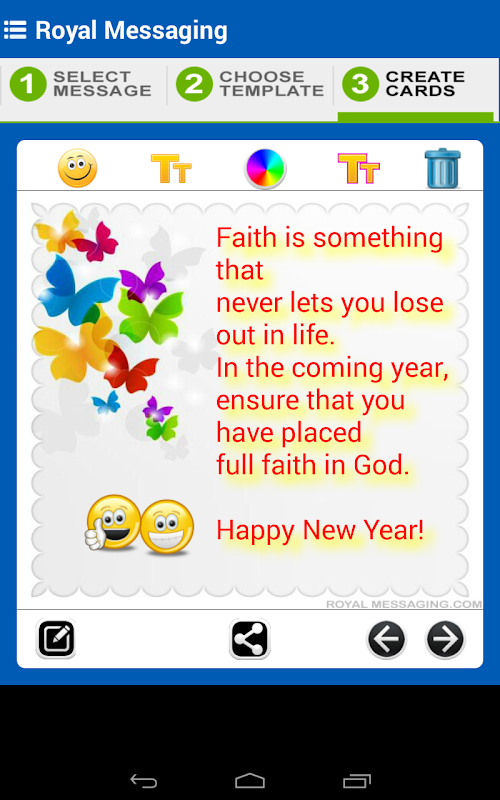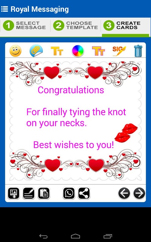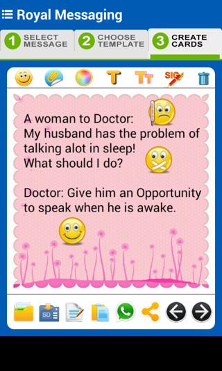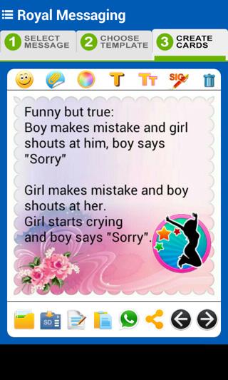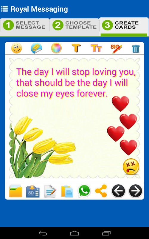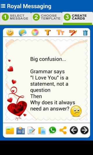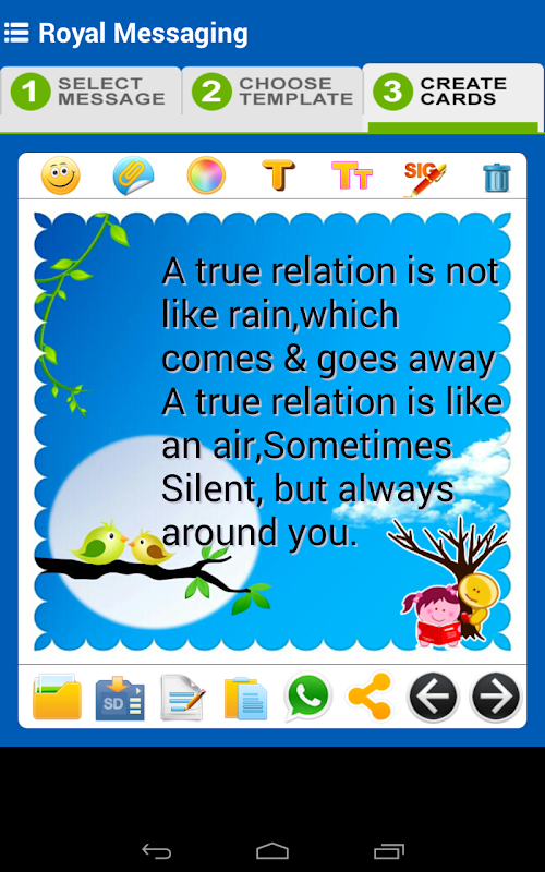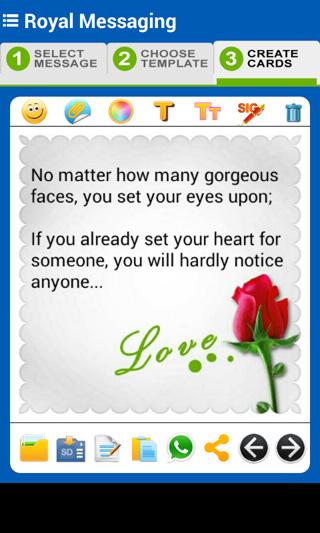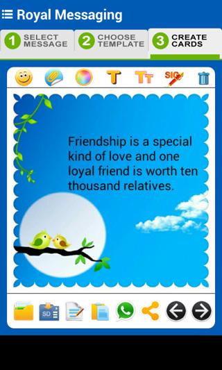 Now you need not to work on writing the messages at all. Just choose the best messages as per your feelings and occassions, select the template, add your icons and stickers and share it with your friends available anywhere like Facebook, Whatsapp, email or any existing medium with damn simple interface.