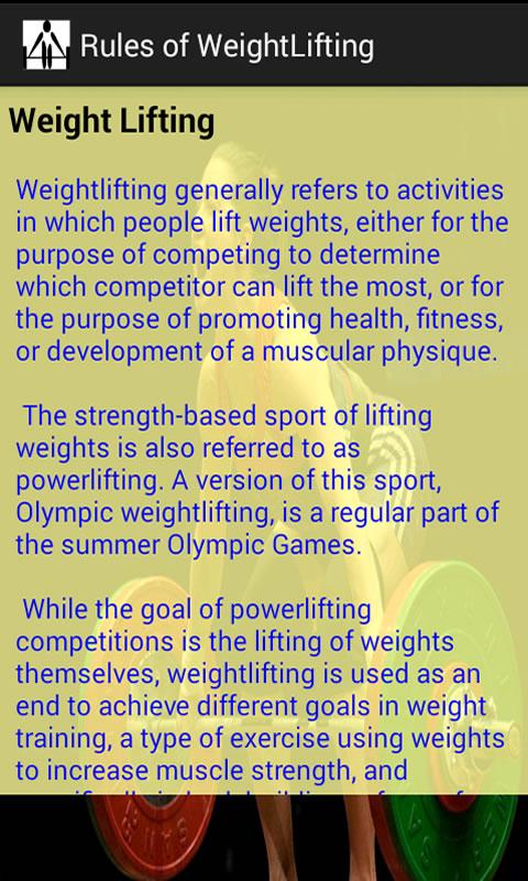 basics of Weight Lifting, learn how to play the sport well, Weight Lifting is a world known sport, and We know you will love this app.