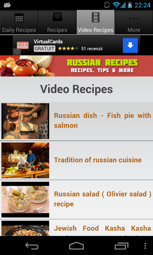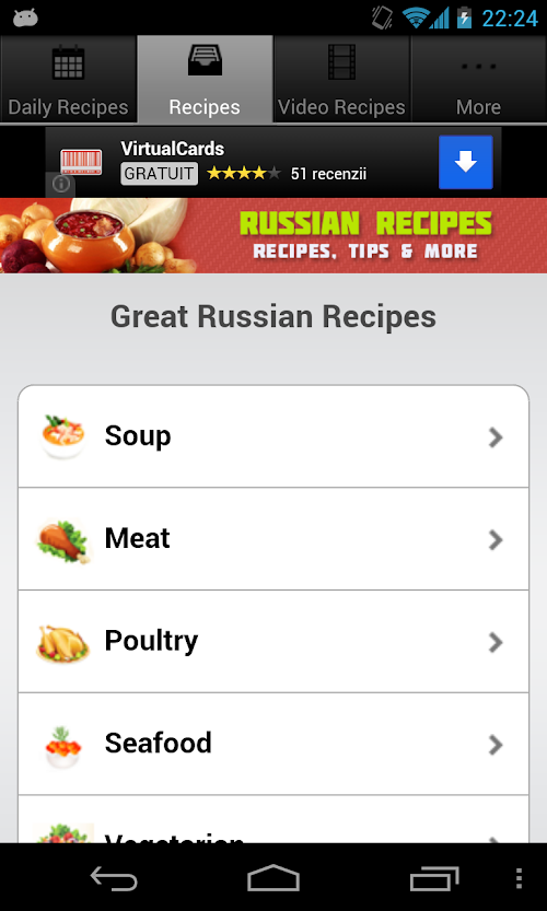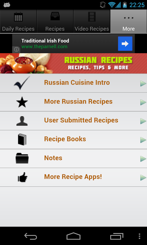 Not only will you find almost 158 delicious Russian recipes, but they are broken down into convenient categories according to the type of dish you want to make. Video recipes will show you exactly what to do, and Daily Recipes will give you brand new recipes EVERY DAY!!