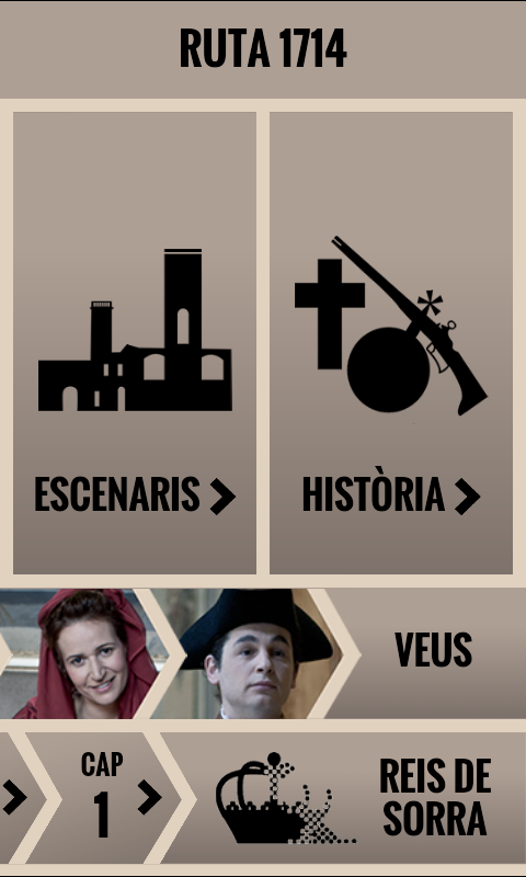 Aquesta app es publica en el marc de la commemoració del Tricentenari del desenllaç de la Guerra de Successió (1714-2014), i la creació de la Ruta 1714, una iniciativa de la Generalitat de Catalunya per posar en valor els escenaris, espais i viles més destacades que conformen el testimoni d’aquell conflicte. L’app et permetrà portar a la butxaca tota la informació necessària per anar recorrent les 55 poblacions que formen la Ruta 1714.The app route in 1714 are three apps into one: a complete guide to cultural and gastronomic major tourist enclaves of the War of Succession in Catalonia; a reporting tool with accurate information about the historical facts of the war and a collection of premium videos, and finally a novel unconventional will publish weekly chapters: Kings of sand. The story invites you to discover the secrets of the eighteenth century that could have changed the future of Europe. Following it, you can accompany the protagonist, Brown labor market, in its quest to recover a lost legacy and compromising letters.