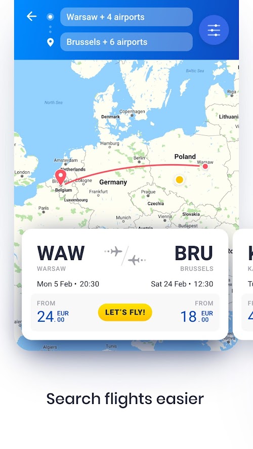 Are you tired of spending too much time looking for a flight that suits you the most? Wouldn't it be easier to select all of the airports from a given country or area and get the cheapest fares immediately? Our map-based search is exactly what you need. Select MULTIPLE origins and destinations and we will show you all of the cheapest fares for them! Simply pick an area on the map, adjust the settings and get the cheapest Ryanair fares at hand. When you have finally picked the route, book it with a single tap through Ryanair - Cheapest Fares app.
