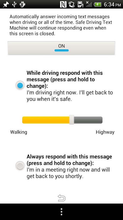 Using the Safe Driving Text Machine texting app, your phone will automatically detect driving conditions and as soon as you receive a text message it will respond with your custom text message. Allowing you to focus on what's important while you are on the road.