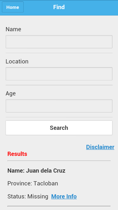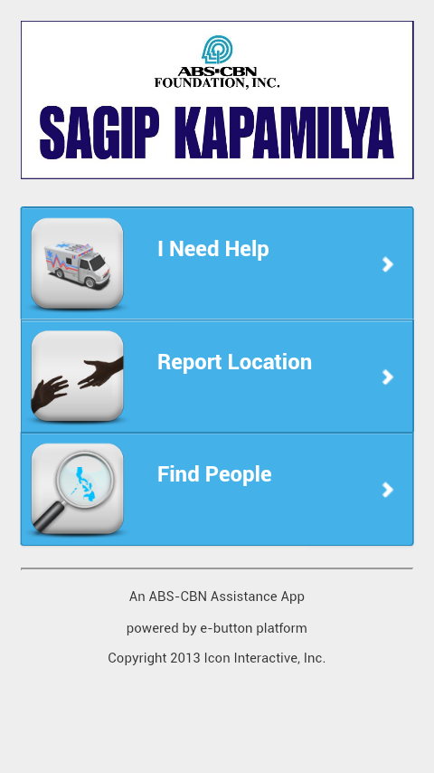Sagip Kapamilya is an emergency assistance app that enables users to identify themselves and their location, find people, submit names and images of unnamed individuals, transmit messages to a central command center for immediate feedback.
