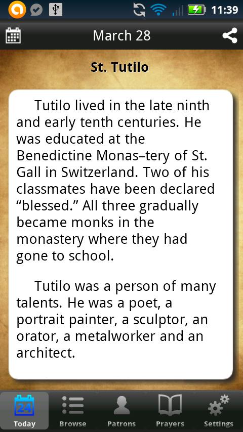 Saint-a-Day is built using content from the extremely popular Saint-a-Day books from the Daughters of St. Paul through their publishing house, Pauline Books & Media.. The application is useful as a reference tool, for daily meditation and prayer, and as a spiritual companion. Saint-a-Day is also practical for teachers, homilists, and leaders who want to bring the lives and examples of the saints into their classrooms, homilies, and groups.